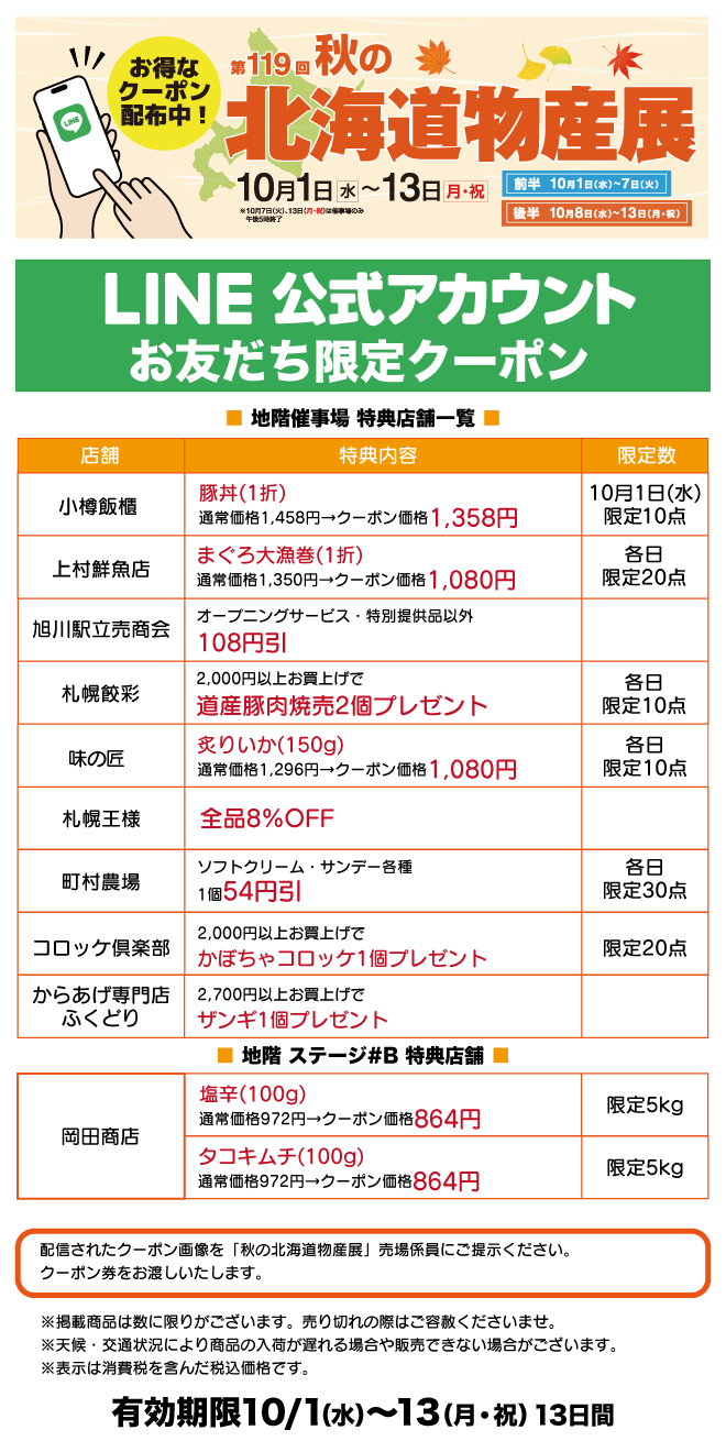 岡島のLINE公式アカウントにお友だち登録していただきますと、10月1日(水)~13日(月・祝)の期間中、『第119回 秋の北海道物産展』で使えるお得なクーポン券をその場でプレゼントいたします!