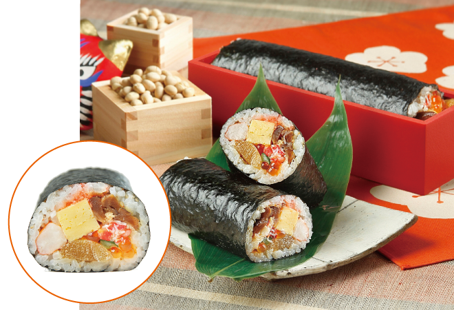 ・煮海老・椎茸煮・味付干瓢・焼穴子・厚焼卵(魚肉すり身、鶏卵、砂糖、その他)
