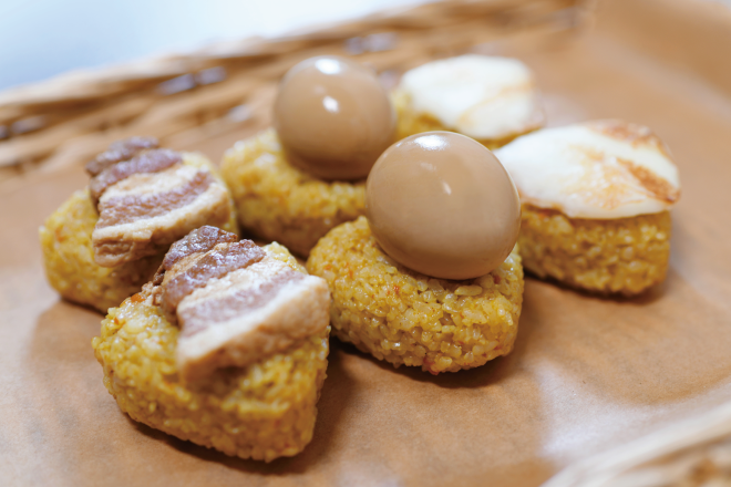 粒が大きくおにぎりに向いているという山梨県産の梨北米を使用。ジョイアルカレー(石和温泉糸柳のカレー)を使った特製おにぎりに、山梨産卵を使った味玉や八ヶ岳のミルクたっぷりのチーズ職人が手作りしたモッツァレラチーズ、角煮をのせたおにぎりなどを販売いたします。