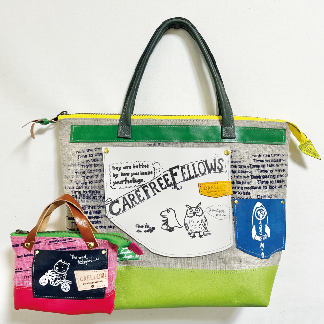 CAELLOW(カエロウ)は、「Carefree fellows=のんきなやつら」を勝手に略した造語です。革や布にオリジナルプリントをあしらったバッグ、小物をご紹介いたします。