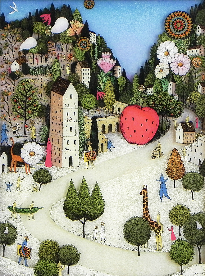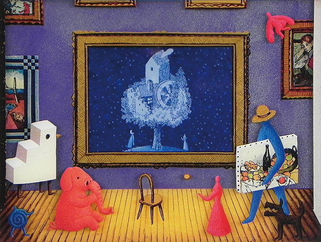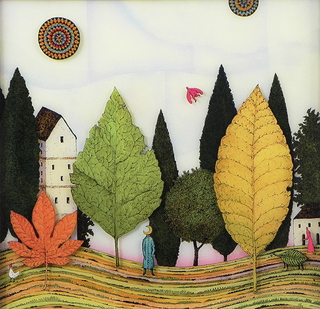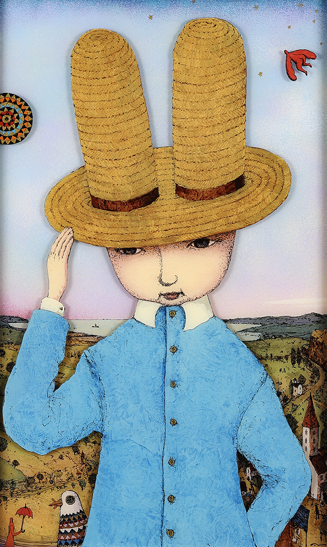 アニメーションのセル画をヒントにアクリル板を2枚重ねることで奥行きを出し、独特な世界観を描くアーティスト。
