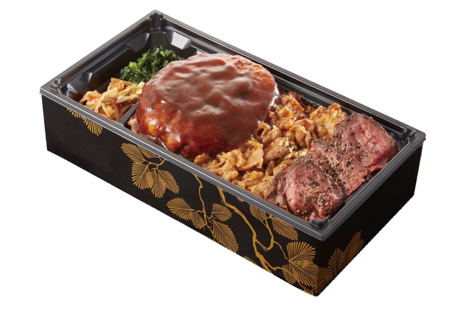 ステーキ・ハンバーグ・焼肉の3種を一度に楽しめる贅沢弁当です。