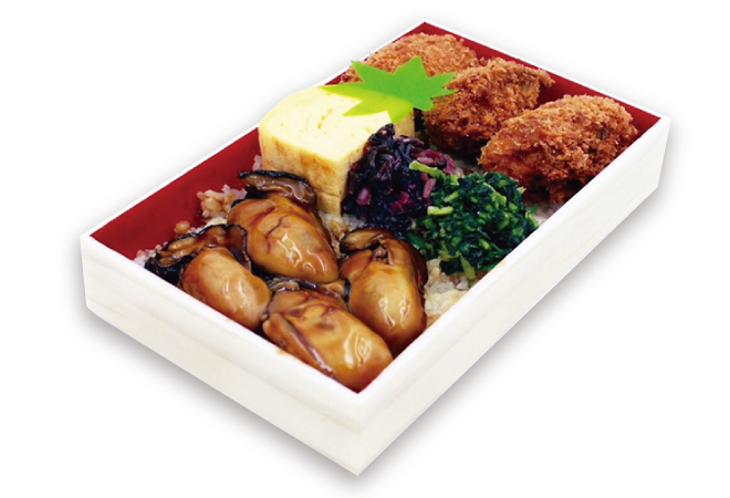 濃厚な牡蠣の旨味が詰まった「かきめし」の上に、瀬戸内海ですくすく育ったぷりっぷりの煮牡蠣、肉厚なカキフライがのったお弁当です。